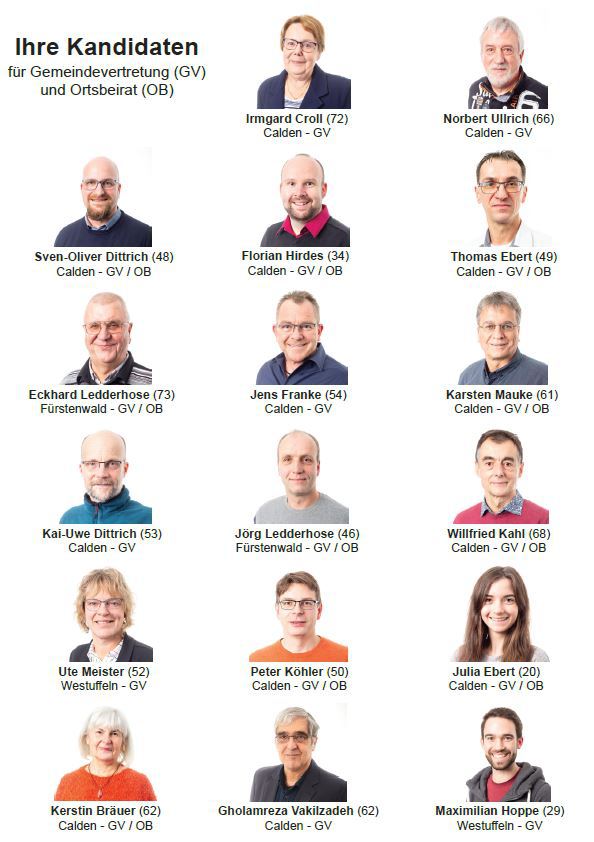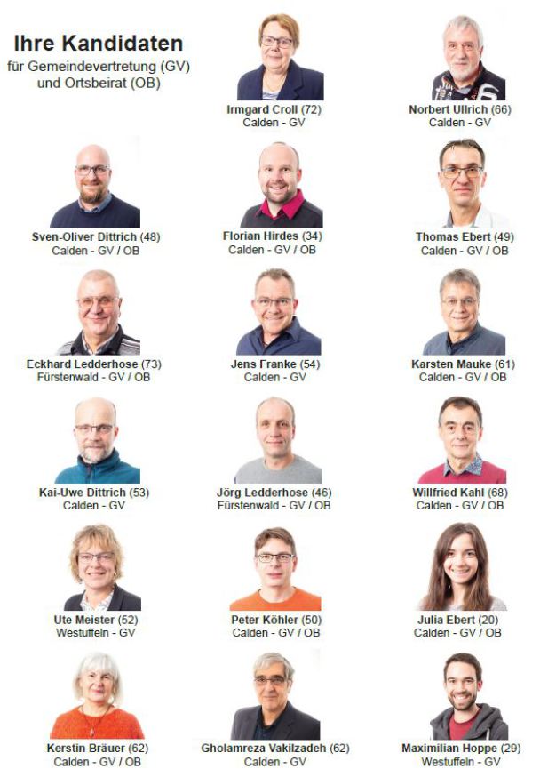 Besonders erfreulich ist, dass zusätzlich zu den Kandidaten mit langjähriger kommunalpolitischer Erfahrung viele neue Kandidaten gewonnen werden konnten, die sich erstmals zukünftig ehrenamtlich engagieren wollen und dies ohne parteipolitische Bindung und Zwänge. Die Neuzugänge sorgen für frischen Wind und bringen viele gute Ideen für die Mitgestaltung ihrer Heimat Calden mit.
